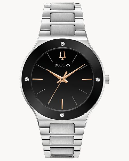 Silver tone stainless steel case with edge to edge black domed metalized crystal. Black dial featuring four diamonds flush set on the crystal. Water resistance to 30 meters.