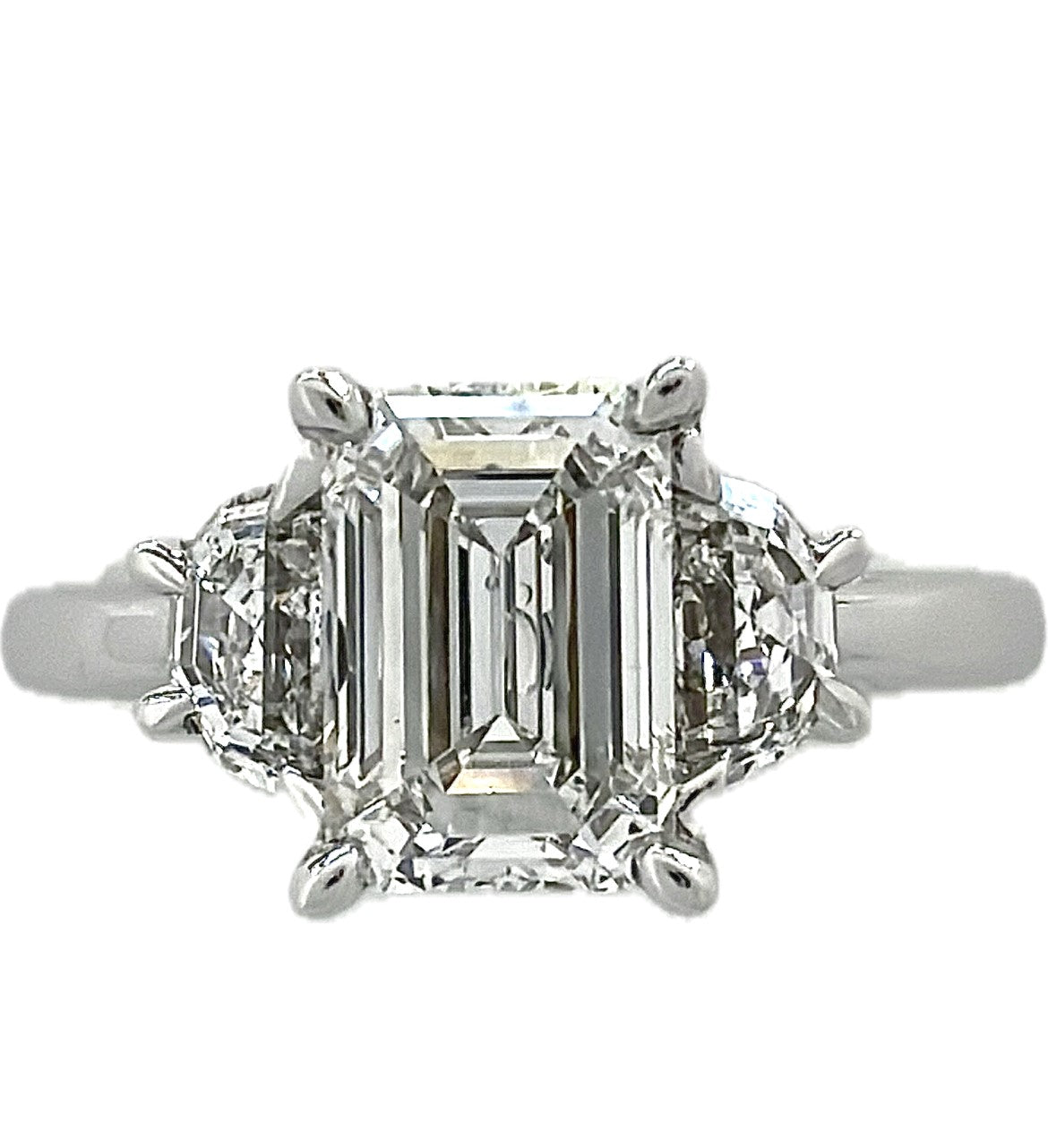 Lady's White 14 Karat 3 Stone Engagement Ring Size 7 With One 1.50Ct Emerald E/F Vs1 Diamond And 2=0.38Tw Half moon E/F Vs1 Diamonds