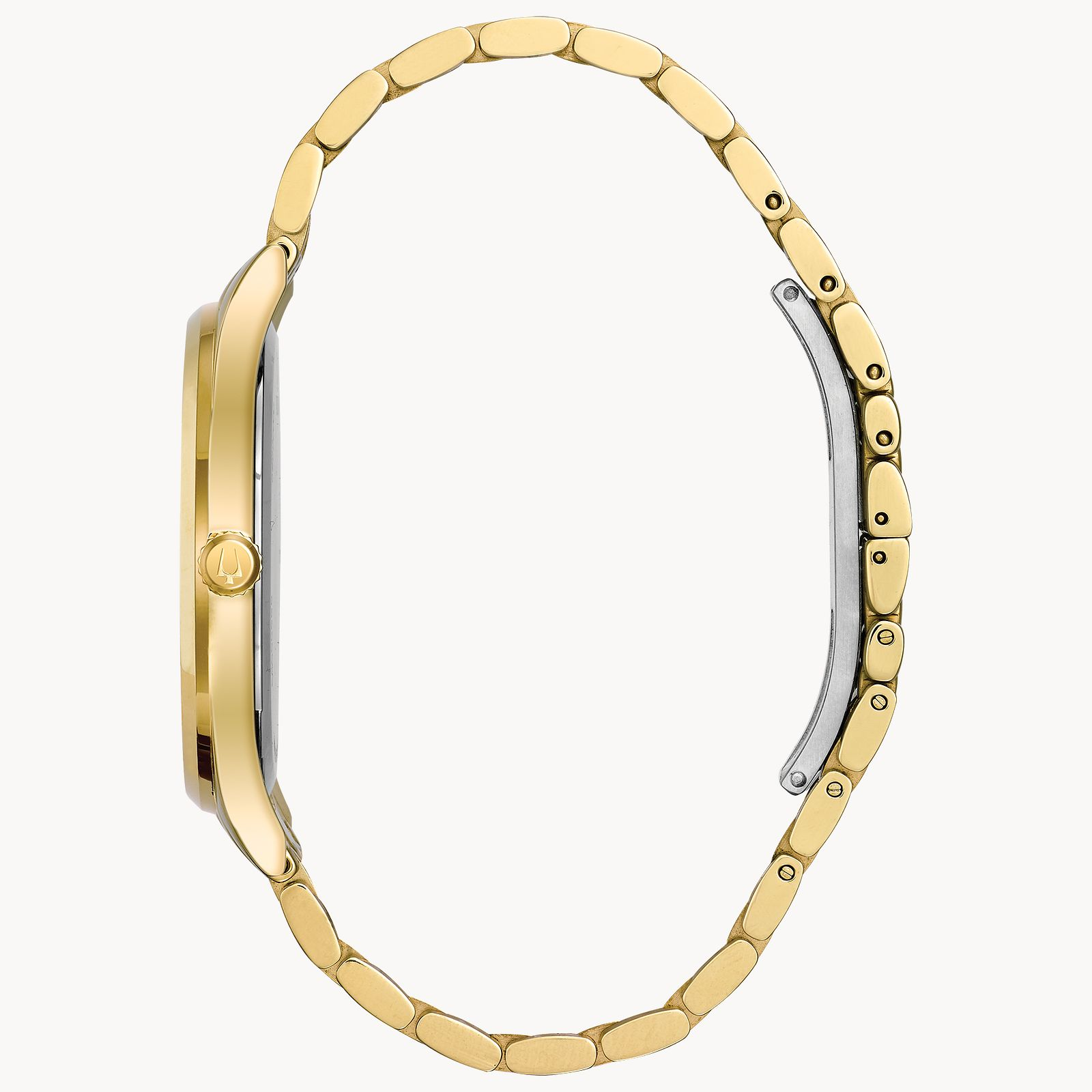 From the Diamonds Collection. New 8-diamond black dial, gold-tone stainless steel case and bracelet with double-press deployment closure, three-hand calendar, and flat mineral glass.