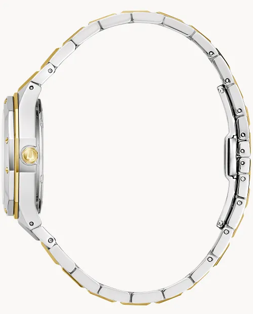 Bold, elevated design characterizes this Classic Bulova Prestige women’s timepiece that balances bold design with an elegant presence. The watch features a faceted 32mm gold- and silver-tone stainless steel case with a geometric bezel, flat sapphire crystal with anti-reflective coating, 100m of water resistance, and a chamfered 3-link bracelet with brushed and polished finishes and a push-button deployant closure. The lustrous mother-of-pearl dial has gold-tone hands and applied markers with Super-LumiNova luminescent fill, 8 dazzling diamonds, and a date display. Striking in both its modernity and its sophistication, this Bulova ladies’ watch is an ideal companion on any wrist.